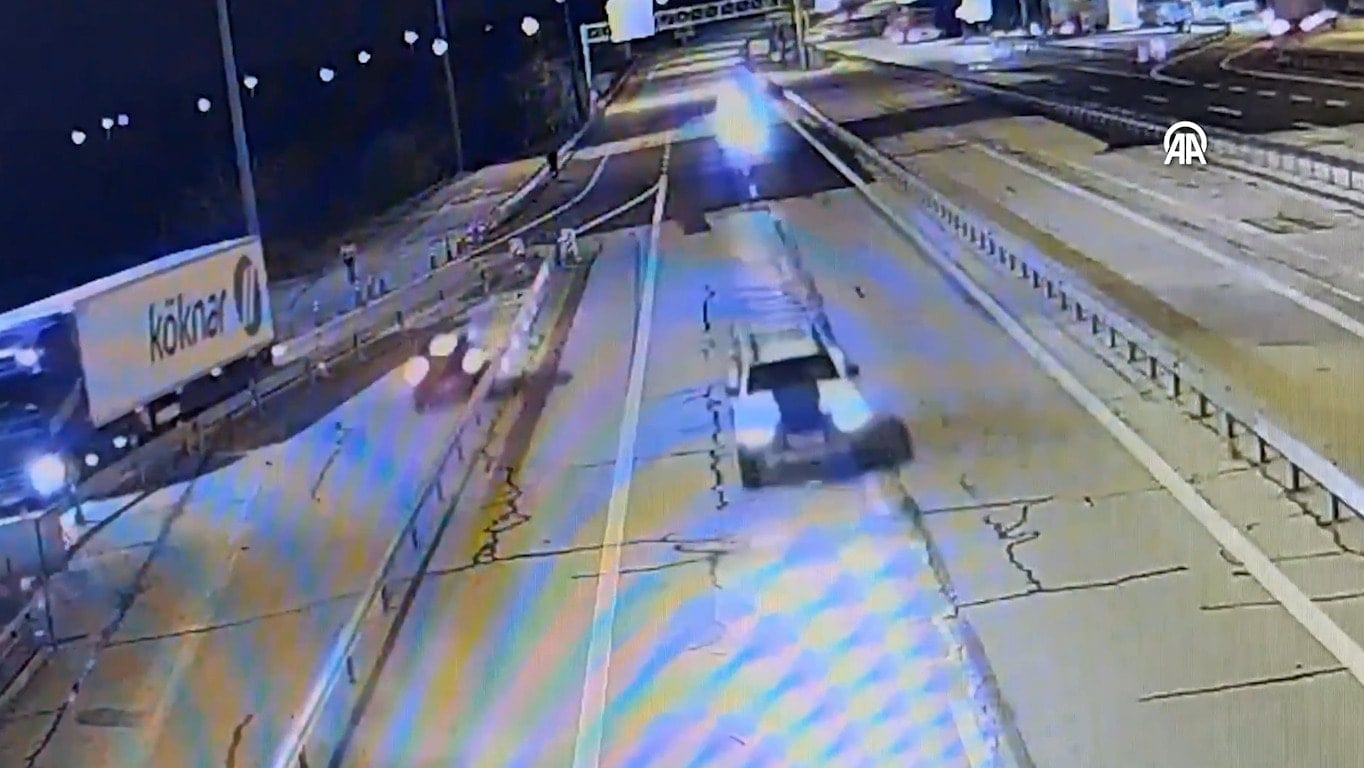 Güvenlik kamerasınca kaydedilen görüntülerde, kaza anında süratle ters yönde seyreden otomobilin bariyerlere çarparak sürüklendiği yer alıyor.