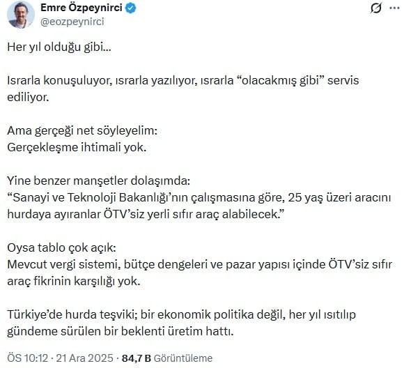 Ünlü otomotiv yazarı Emre Özpeynirci, X hesabından yaptığı paylaşımda, konunun ısrarla “olacakmış gibi” servis edildiğini ancak bunun gerçekçi olmadığını vurguladı.