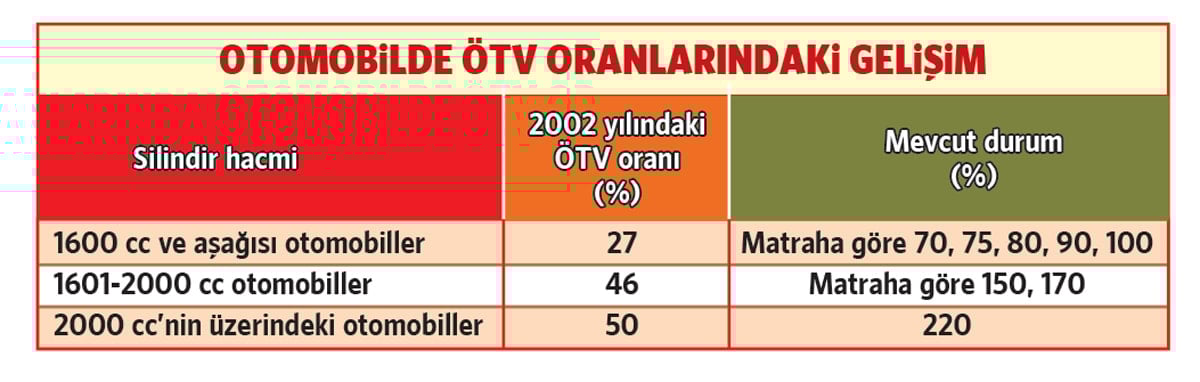 Otomobile yapılan ÖTV zamlarının bir kısmı ÖTV oranlarında artış şeklinde açık bir şekilde yapılmaktadır. ÖTV Kanunu’nun yürürlüğe girdiği 2002 yılında %27 ile %50 aralığında değişen ÖTV oranları bugün %70 ile %220 aralığına çıkmıştır.