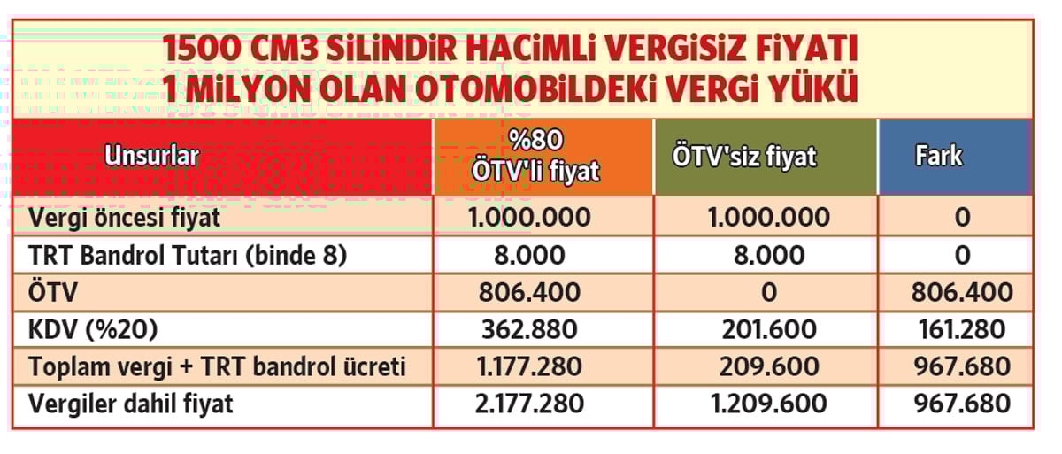 Yukarıdaki tabloda bugün C segment orta özellikli vergisiz fiyatı 1 milyon TL olan bir otomobilin ÖTV nedeniyle vatandaşın sırtına yüklediği vergi yükü açık bir şekilde görülmektedir. Dünyanın pek çok ülkesinde ÖTV olmadığı için kişiler vergisiz fiyatı 1 milyon olan araca vergilerle birlikte 1 milyon 200 bin TL’ye sahip olabilirken, vatandaşlarımız neredeyse iki katı bedel ödeyerek aynı otomobile erişebilmektedir.