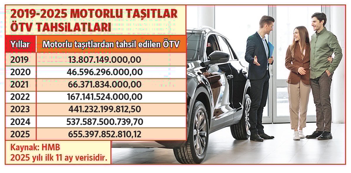 Motorlu taşıtlar üzerinden alınan ÖTV her yıl yeni rekorlar kırıyor. 2019 yılında motorlu taşıtlar üzerinden alınan ÖTV tutarı 13.8 milyar lira iken 2025’in ilk 11 ayında 655.4 milyar liraya ulaşmıştır. 2019-2025 döneminde toplam vergi gelirlerindeki artış %1.384 iken motorlu taşıt ÖTV gelirlerindeki artış %4.647 olmuştur.