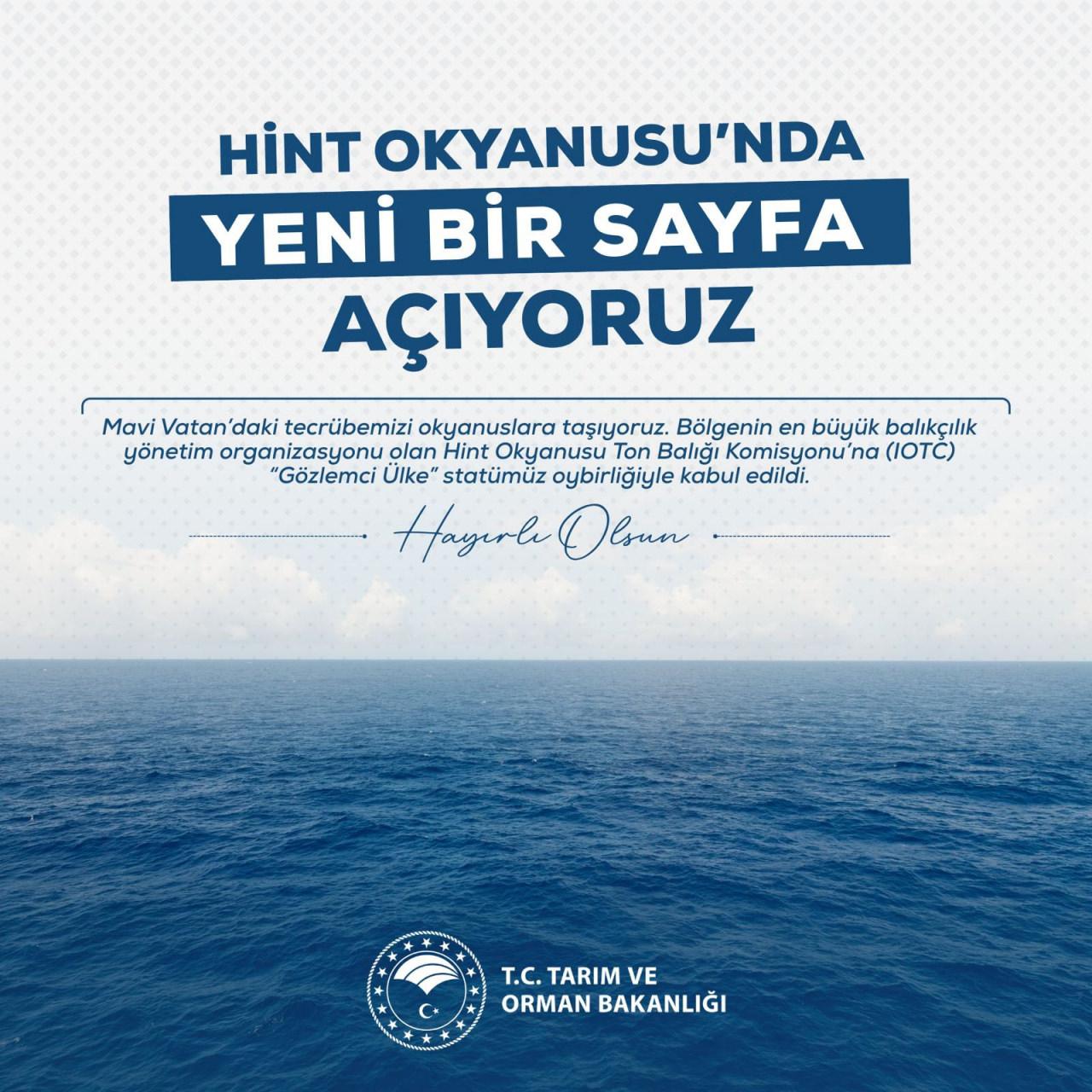 "Dünyanın en önemli bölgesel balıkçılık yönetim organizasyonlarından biri olan IOTC nezdinde 'gözlemci ülke' statümüz oy birliğiyle kabul edildi. Hedefimiz, orta vadede 'tam üye' olarak balıkçılık filomuza yeni ufuklar açmak ve bölge ülkeleriyle stratejik işbirliklerimizi güçlendirmek. Küresel balıkçılık yönetiminde sorumlu ve etkin bir aktör olarak, uluslararası alanda yapıcı katkılar sunmaya kararlılıkla devam edeceğiz. Ülkemize ve sektörümüze hayırlı olsun."