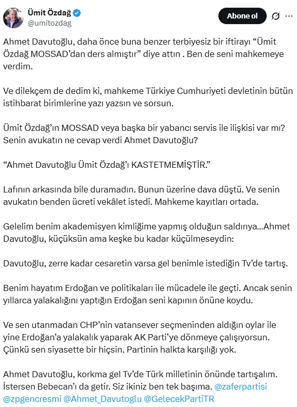 Davutoğlu'nun Haberler.com yayınındaki sözlerine Zafer Partisi Genel Başkanı Ümit Özdağ, X hesabından yanıt verdi. Özdağ paylaşımında şu ifadeleri kullandı "Ahmet Davutoğlu, daha önce buna benzer terbiyesiz bir iftirayı 'Ümit Özdağ MOSSAD'dan ders almıştır' diye attın . Ben de seni mahkemeye verdim. Ve dilekçem de dedim ki, mahkeme Türkiye Cumhuriyeti devletinin bütün istihbarat birimlerine yazı yazsın ve sorsun. Ümit Özdağ'ın MOSSAD veya başka bir yabancı servis ile ilişkisi var mı? Senin avukatın ne cevap verdi Ahmet Davutoğlu?