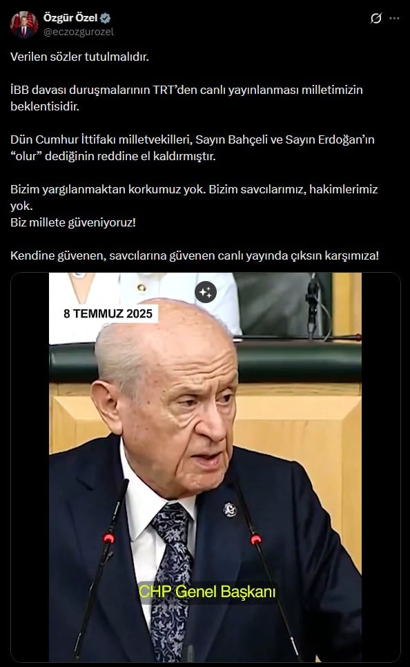 "Verilen sözler tutulmalıdır. İBB davası duruşmalarının TRT'den canlı yayınlanması milletimizin beklentisidir. Dün Cumhur İttifakı milletvekilleri, Sayın Bahçeli ve Sayın Erdoğan'ın 'olur' dediğinin reddine el kaldırmıştır. Bizim yargılanmaktan korkumuz yok. Bizim savcılarımız, hakimlerimiz yok. Biz millete güveniyoruz! Kendine güvenen, savcılarına güvenen canlı yayında çıksın karşımıza!"