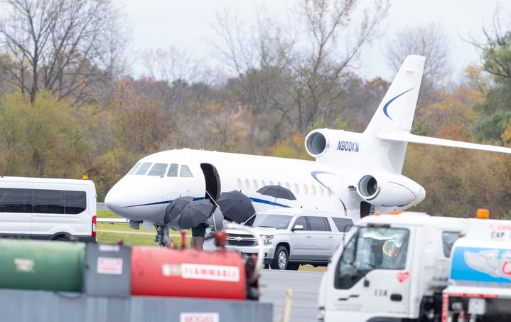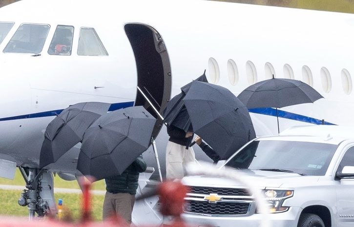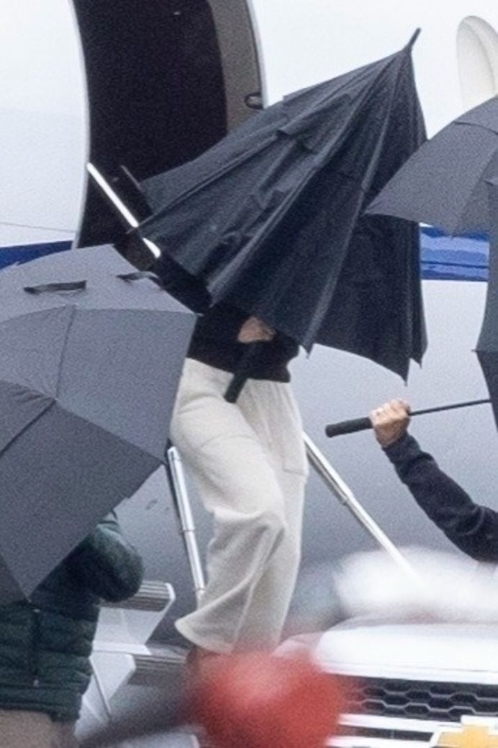 Taylor Swift, özel jetle New Jersey'deki Morristown Havalimanı'na indikten sonra etrafını güvenlik ekibi sardı. Ünlü şarkıcı, uçaktan şemsiye duvarı örülerek indi.