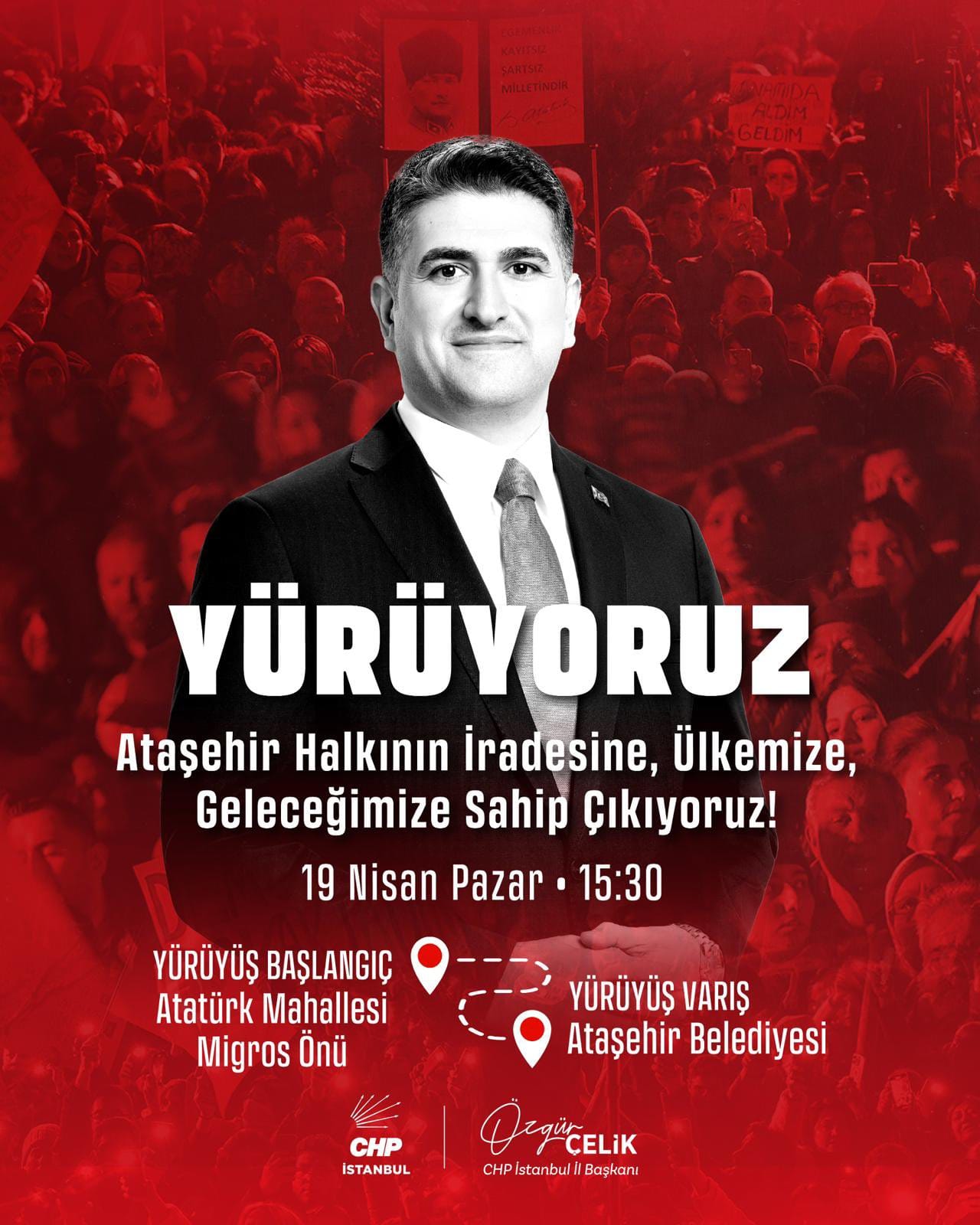 Çelik, "Bu ablukaya teslim olmayacağız. Halkımızın iradesine, Ataşehir’e ve Onursal Adıgüzel’e sahip çıkmak için meydanlarda olacağız" ifadeleriyle duyurduğu yürüyüşün, 19 Nisan saat 15.30'da Ataşehir Atatürk Mahallesi Migros önünde başlayacağını belirtti.