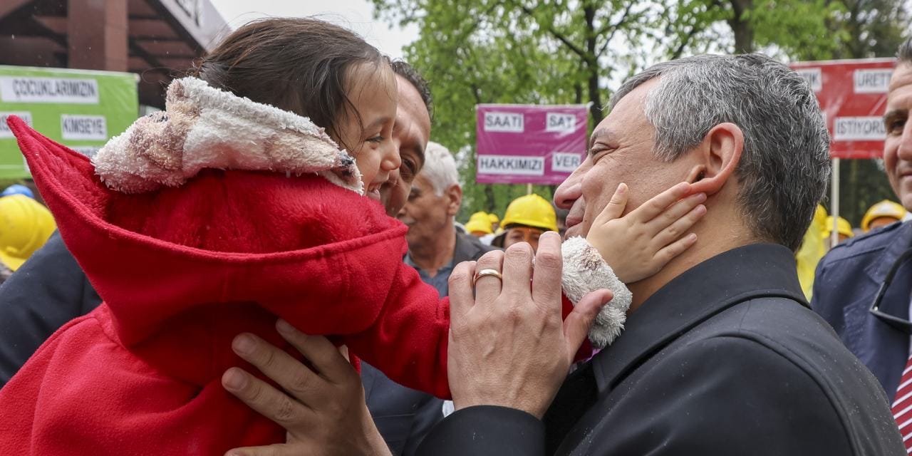 Özel, “Bugün 23 Nisan. Burada bir madenci oğlu babası hakkını alsın diye gelmiş, bir madenci kızı Melek babası hakkını alsın diye gelmiş. Eşler, eşlerinin yanına gelmiş” dedi.