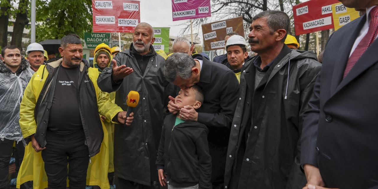 Ziyaret sırasında işçilerin ailelerinin de eylem alanında bulunduğuna dikkat çeken Özel, 23 Nisan’a vurgu yaptı.