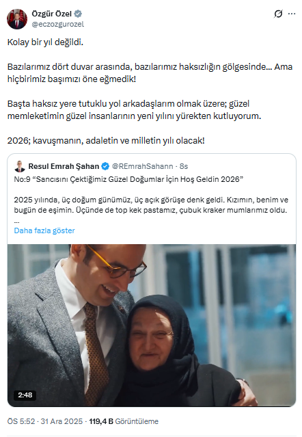 CHP Genel Başkanı Özgür Özel ise, Şahan2ın bu paylaşımını kendi hesabından alıntılayarak, "2026; kavuşmanın, adaletin ve milletin yılı olacak!" dedi.