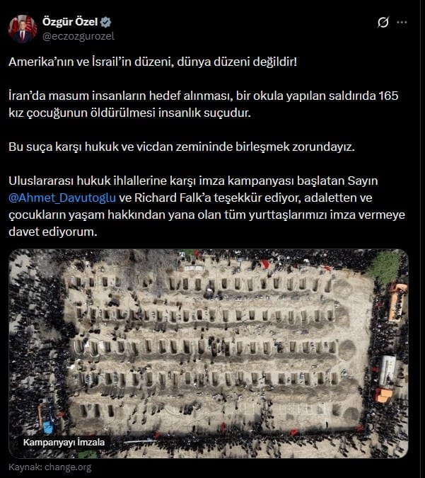 ABD ve İsrail'in İran'ın Minab kentine düzenlediği askeri operasyonda bir ilkokulun vurulması ve 165 kız çocuğunun hayatını kaybetmesi, uluslararası hukuk ihlallerini yeniden tartışmaya açtı. Gelecek Partisi Genel Başkanı Ahmet Davutoğlu ve Eski BM Raportörü Richard Falk'ın öncülüğünde başlatılan imza kampanyasına destek veren CHP Genel Başkanı Özgür Özel, faillerin yargılanması için yurttaşları harekete geçmeye çağırdı.