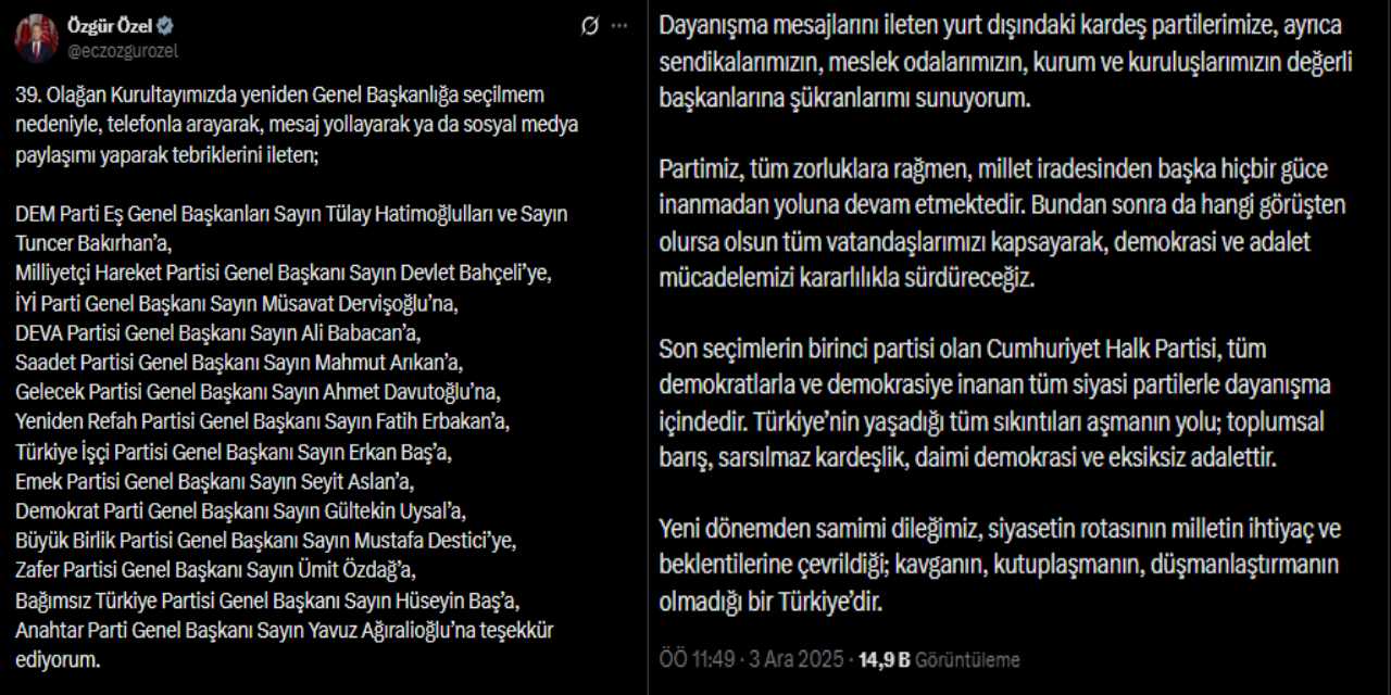 ÖZGÜR ÖZEL TEBRİK İÇİN ARAYAN GENEL BAŞKANLARI SAYDITebriklerin telefon, sosyal medya paylaşımları ve mesajlarla kendisine ulaştığını ifade eden Özgür Özel paylaşımında tebriklerini ulaştıran genel başkanlara ayrıca yer vererek isimleri şu şekilde açıkladı: