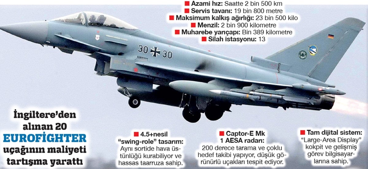 “Yerli ve Milli” KAAN savaş uçağı için motor bulunamadı. Rusya’dan S-400 hava savunma sistemi alınca parasını ödediğimiz F-35 projesinden çıkarıldık. F-16 modernizasyonunda da ABD ile sorun yaşayınca yüzümüzü Alman, İtalyan, İngiliz ve İspanyol ortak yapımı Eurofighter’a çevirdik. İngiltere ile 20 uçak için anlaşma sağlandı ancak ödeyeceğimiz 8 milyar sterlin tartışma konusu oldu.