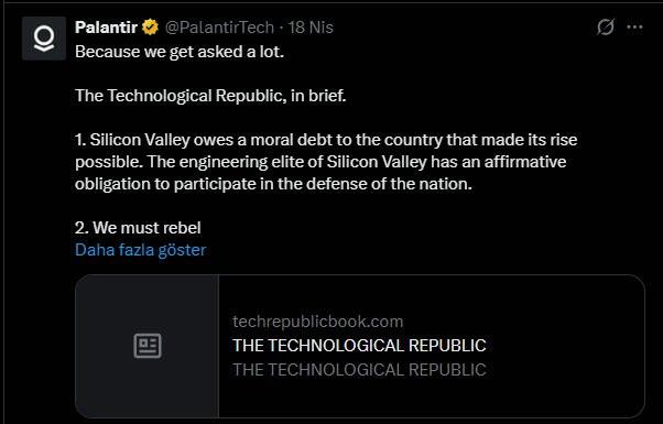 Palantir, Teknoloji Cumhuriyeti (The Technological Republic) manifestosunu kamuoyuna duyurdu. Şirketin CEO'su Alex Karp ve Nicholas W. Zamiska tarafından kaleme alınan aynı isimli kitaptan esinlenen bu 22 maddelik bildiri, sadece bir teknoloji vizyonu değil, aynı zamanda Batı medeniyetinin geleceğine dair sert bir siyasi ve askeri projeksiyon sunuyor. Bildiride özellikle bazı maddeler dikkat çekti.