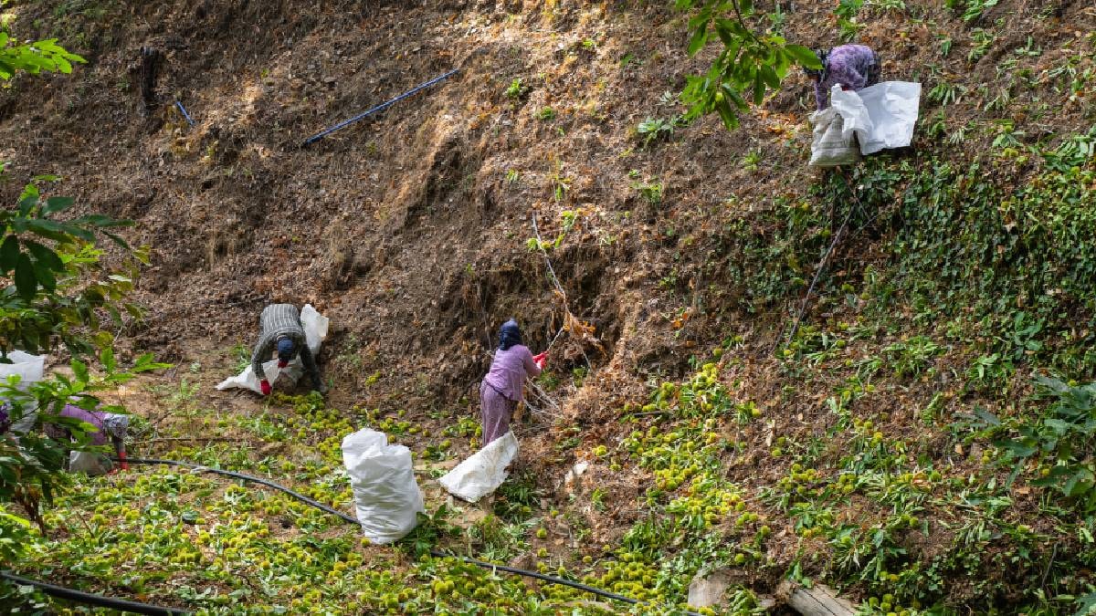 Geçimini büyük ölçüde kestaneden sağlayan üreticiler, sabahın erken saatlerinde dağ yamaçlarındaki bahçelere giderek zorlu bir mesaiye başlıyor. Yaklaşık 20–30 metreye ulaşan ağaçlara tırmanan işçiler, uzun sırıklarla kestane kozalaklarını düşürüyor. Daha sonra toplanan kozalaklar çuvallanarak, meyvelerin kabuklarından ayrılması için kuyulara gömülüyor.