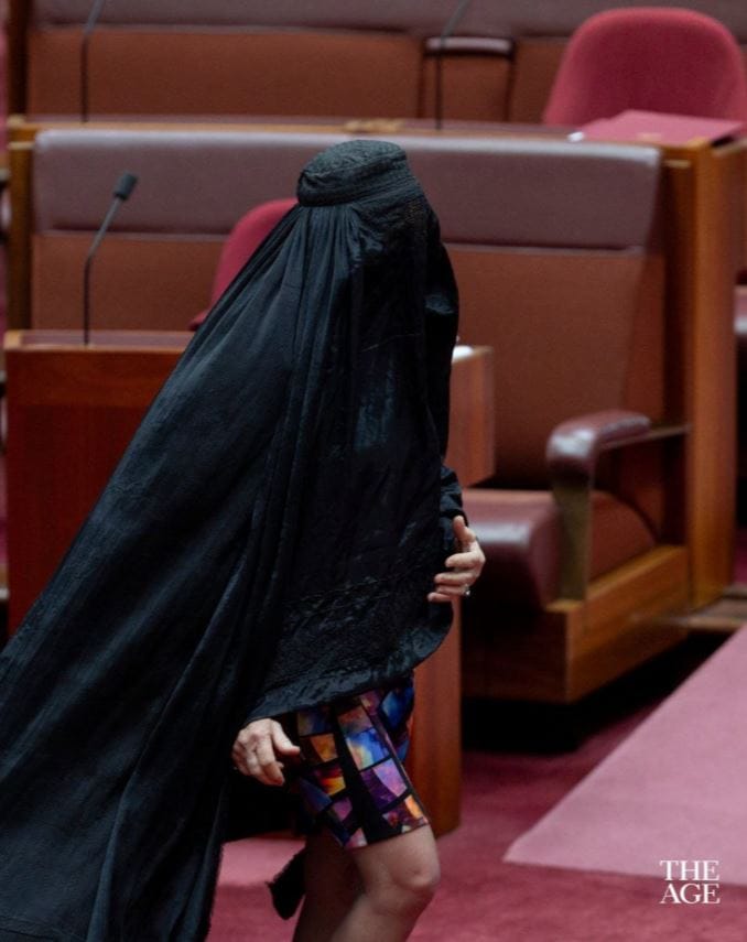 Avustralya'da aşırı sağcı Senatör Pauline Hanson, ülkede burkanın kamusal alanda yasaklanmasını talep ettiği yasa tasarısının reddedilmesini parlamentoda burka giyerek tepki gösterdi.