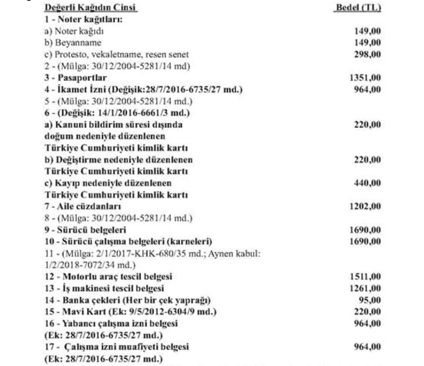 Ticari hayatı ve hukuki işlemleri yakından ilgilendiren noter kağıtları ve beyanname bedelleri 149,00 TL olarak belirlenirken; protesto, vekaletname ve resen senet bedelleri 298,00 TL oldu. Banka çeklerinin her bir yaprağı için belirlenen bedel ise 95,00 TL olarak açıklandı.