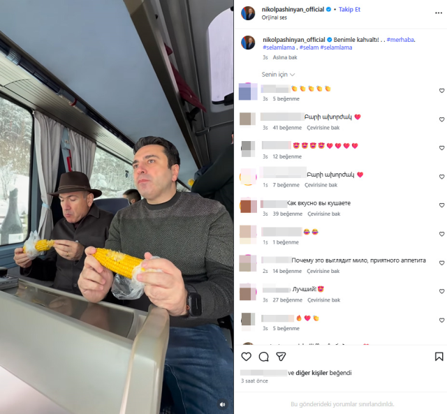GERİLİMİN İKİNCİ GÜNÜNDE MISIRLI PAYLAŞIMOrta Doğu’daki gerilimin ikinci gününde Paşinyan bu kez mısır yediği anlara dair görüntüler paylaştı. Peş peşe gelen paylaşımlar, saldırılar karşısında Erivan yönetiminin tutumuna ilişkin yorumlara neden oldu.