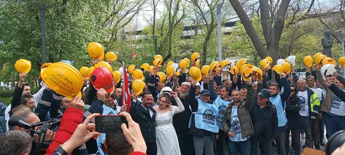 Sabahattin Yıldız’dan bu kadar mı korkuyorsunuz?Nikah dairesinden çıkan yeni çift madencilere destek verdi.