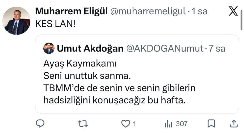Akdoğan'ın paylaşımını alıntılayan Eligül, CHP milletvekiline sert tepki gösterdi. 2014 yerel seçimlerinde Ankara Etimesgut Belediye Başkan adayı olduğu ortaya çıkan Eligül, Akdoğan'a yönelik "Kes lan!" ifadesini kullandı.