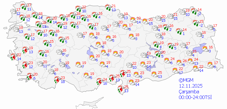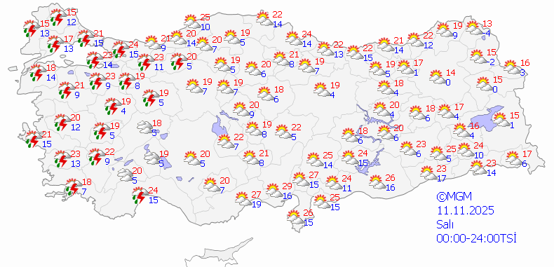 Meteoroloji Genel Müdürlüğü tarafından yapılan tahminlere göre bugün ülkemizin kuzeybatı kesimleri parçalı yer yer çok bulutlu, Edirne, Kırklareli, Tekirdağ, Çanakkale çevreleri ile Balıkesir'in batı ilçelerinin aralıklı sağanak yağışlı, diğer yerlerin az bulutlu ve açık geçeceği tahmin ediliyor. Sabah ve gece saatlerinde Marmara'nın güney ve doğusu, İç Ege, Batı Akdeniz'in iç kesimleri ile Batı ve Orta Karadeniz'in iç kesimlerinde pus ve yer yer sis bekleniyor.