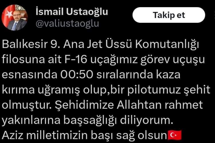 Balıkesir 9. Ana Jet Üssü'nden gece saat 00.50 sıralarında havalanan F-16 tipi savaş uçağı kalkıştan 6 dakika sonra Karesi ilçesine bağlı Naifli köyü kırsalında kaza kırıma uğradı.