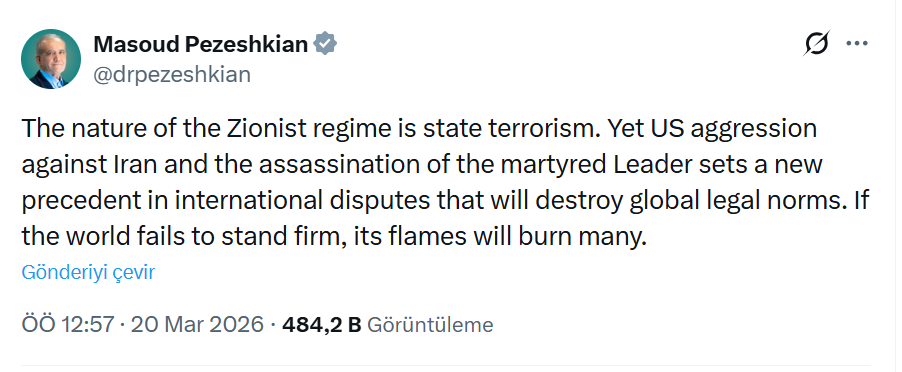 İran Cumhurbaşkanı Mesud Pezeşkiyan, sosyal medya platformu X üzerinden yaptığı açıklamada, İsrail’i “devlet terörü” ile suçladı. Pezeşkiyan, ABD ve İsrail'in İran’a yönelik askeri müdahalesi ve ülkenin dini lideri Ali Hamaney’in hedef alınmasının, uluslararası sistem açısından tehlikeli bir kırılma noktası olduğunu vurguladı.