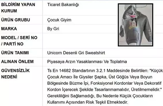 Ticaret Bakanlığı, piyasalarda denetimlerini sürdürürken Güvensiz Ürün Bilgi Sistemi (GÜBİS) üzerinden iki yeni ürün için toplatma kararı açıkladı. Bakanlığın yaptığı duyuruya göre, "By Gri" markalı unicorn desenli çocuk sweatshirt ve "Follow Me" markalı plastik masa, güvenlik testlerinde başarısız oldu ve piyasaya arzı yasaklandı.