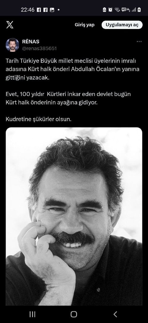 “Tarih Türkiye Büyük Millet Meclisi üyelerinin İmralı Adası’na Kürt halk önderi Abdullah Öcalan’ın yanına gittiğini yazacak. Evet, 100 yıldır Kürtleri inkar eden devlet bugün Kürt halk önderinin ayağına gidiyor. Kudretine şükürler olsun.”