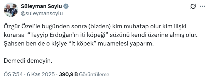 "Özgür Özel’le bugünden sonra (bizden) kim muhatap olur kim ilişki kurarsa “Tayyip Erdoğan’ın iti köpeği” sözünü kendi üzerine almış olur. Şahsen ben de o kişiye “it köpek” muamelesi yaparım. Demedi demeyin."