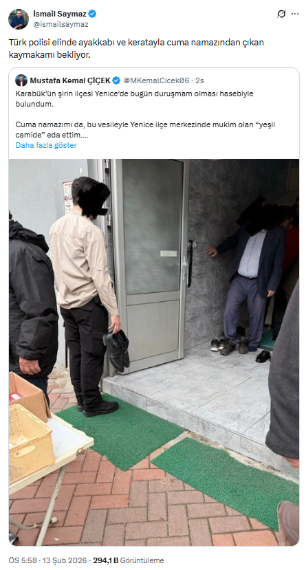 POLİSİN GÖREVİ BU MU?Kaymakamın, koruma polisine ayakkabısını taşıtması sosyal medyada tepkilere neden oldu. Kullanıcılar, polislerin görevlerinin bu olmadığını belirterek tepki gösterirken, Halktv.com.tr yazarı İsmail Saymaz da paylaşımı alıntılayarak, "Türk polisi elinde ayakkabı ve keratayla cuma namazından çıkan kaymakamı bekliyor" ifadeleriyle durumun vahametine dikkat çekti.
