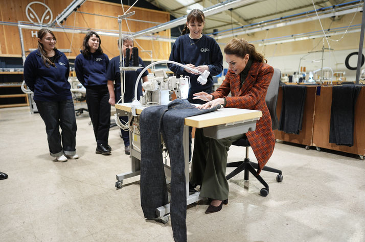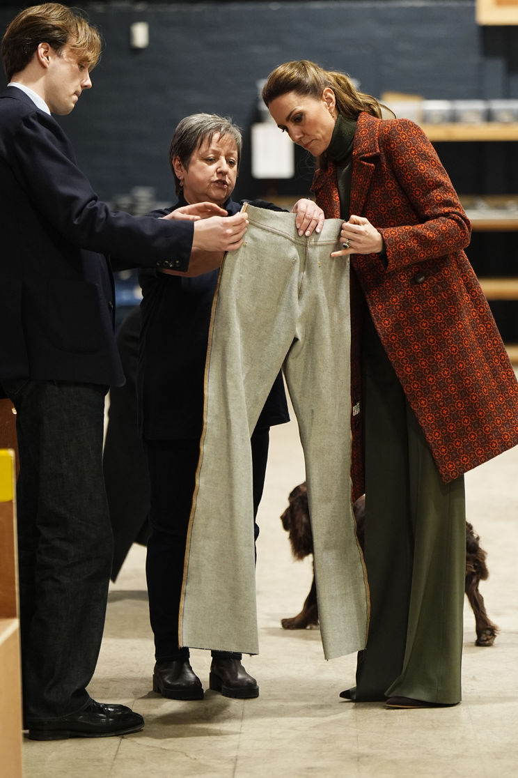 Ziyareti sırasında Prenses Kate, bir pantolon hazırlanırken kot kumaşını kesmeyi de denedi.