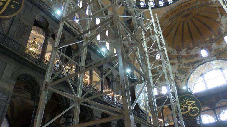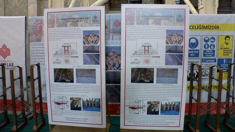 İçerideki iskelenin ne amaçla kuruluyor nasıl kuruluyor bununla ilgili bilgiler var belki arkadaşlarımız artık bu vinçlerle ilgili de bir plan hazırlarlar. Onu da yapabilirler böylece daha bilgilendirici olur. Aslında burada bizdeki hata bu bilgileri basına eksik bildirmiş olmamız ya da kamuoyuna eksik bildirmiş olmamız. Oradan kaynaklanıyor ama bu gene de arkadaşlarımız bu panoları bir okusaydı ve ondan sonra bu tür yayınlar yapılsaydı daha iyi olurdu. Çünkü bir de bunun söküm zamanı var. Burun bir şeyi de iç kısımda da dışarıda uygulama yaparken iç kısımdaki mozaiklerin korunması mozaikler de olabilecek herhangi bir şey anında müdahale etmek için içeride de bir yürüyüş platformu oluşturulacak. Burada gördüğünüz şu ayakta bir asansör oluşturulacak yukarı çıkıp inmeler için. Bunların olması diğer dış kubbe dışında yapacağımız uygulamalar için muhakkak gerekli olan uygulamalar. O yüzden de bunu yapıyoruz" şeklinde konuştu.