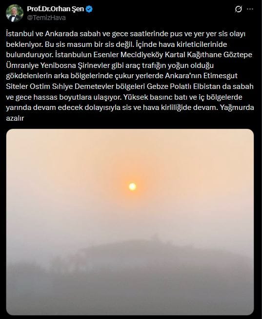SİSİN İÇİNDEKİ GİZLİ TEHLİKE: HAVA KİRLİLİĞİYüksek basınç sisteminin etkisiyle rüzgarın durma noktasına gelmesi, yer seviyesindeki kirli havayı adeta yere hapsetti. Prof. Dr. Şen, sosyal medya üzerinden yaptığı uyarıda bu sisin sadece bir doğa olayı olmadığını, egzoz gazları ve sanayi atıklarıyla birleşen bir kirlilik tabakası olduğunu ifade etti. Özellikle rüzgar almayan ve çukurda kalan bölgelerde kirliliğin dağılamayarak yoğunlaştığına dikkat çekildi.