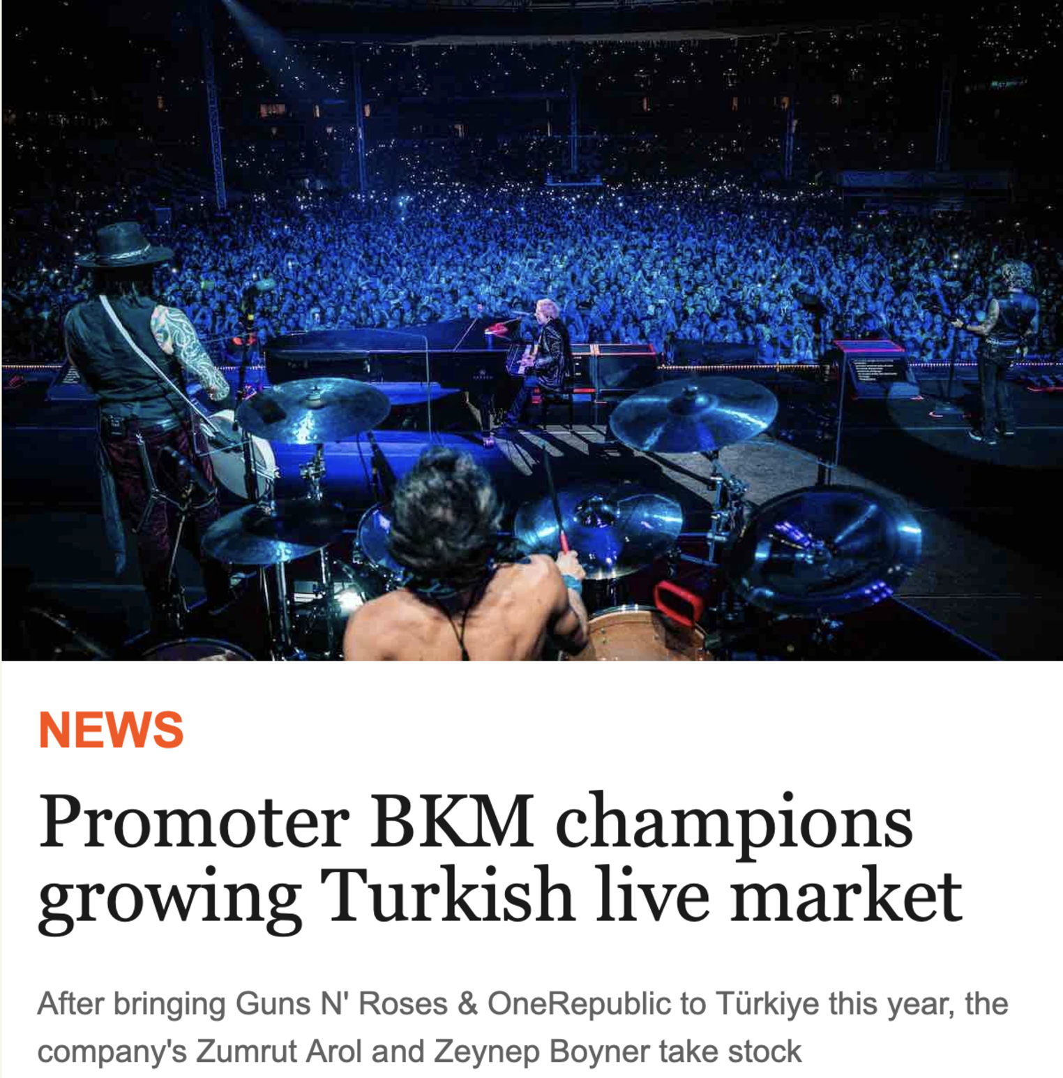 .png Guns N’ Roses ve OneRepublic gibi dünya devlerini Türkiye’ye getiren BKM, Avrupa basınında artık “yükselen değil, oyunu belirleyen pazarın mimarı” olarak anılıyor. Haberlerde özellikle BKM CEO’su Zümrüt Arol ve Uluslararası Etkinlikler Yöneticisi Zeynep Boyner’in vizyonu ve operasyon başarısı dikkat çekiyor. “Türkiye’de konserlerin yankısı hâlâ sürüyor” yorumları manşetlerden inmiyor.
