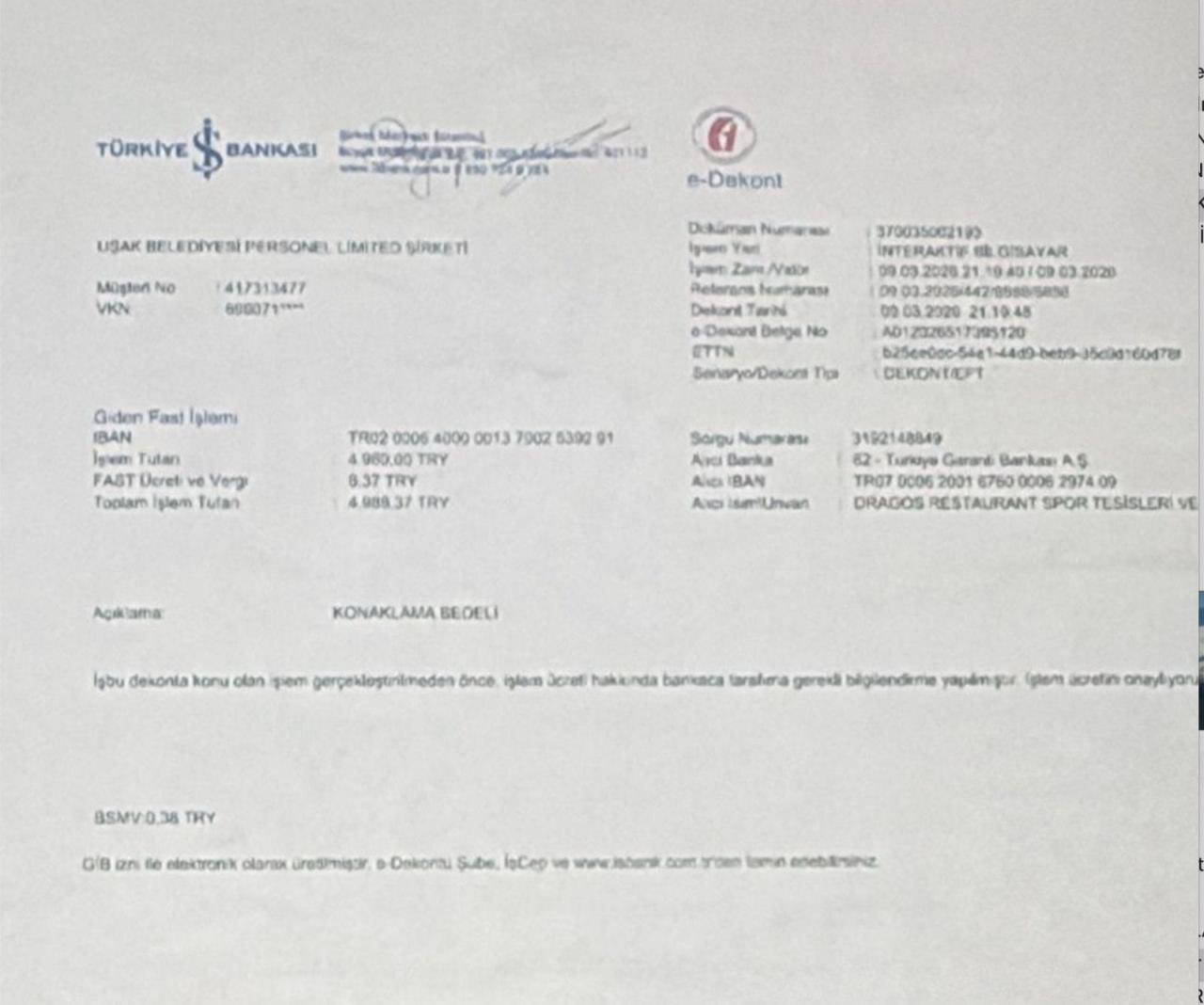 İddialara göre, 9 Mart 2026 tarihinde yapılan ve Ramazan ayına denk gelen bir harcamanın, Uşak Belediyesi Personel Limited Şirketi’ne fatura edildiği öğrenildi.