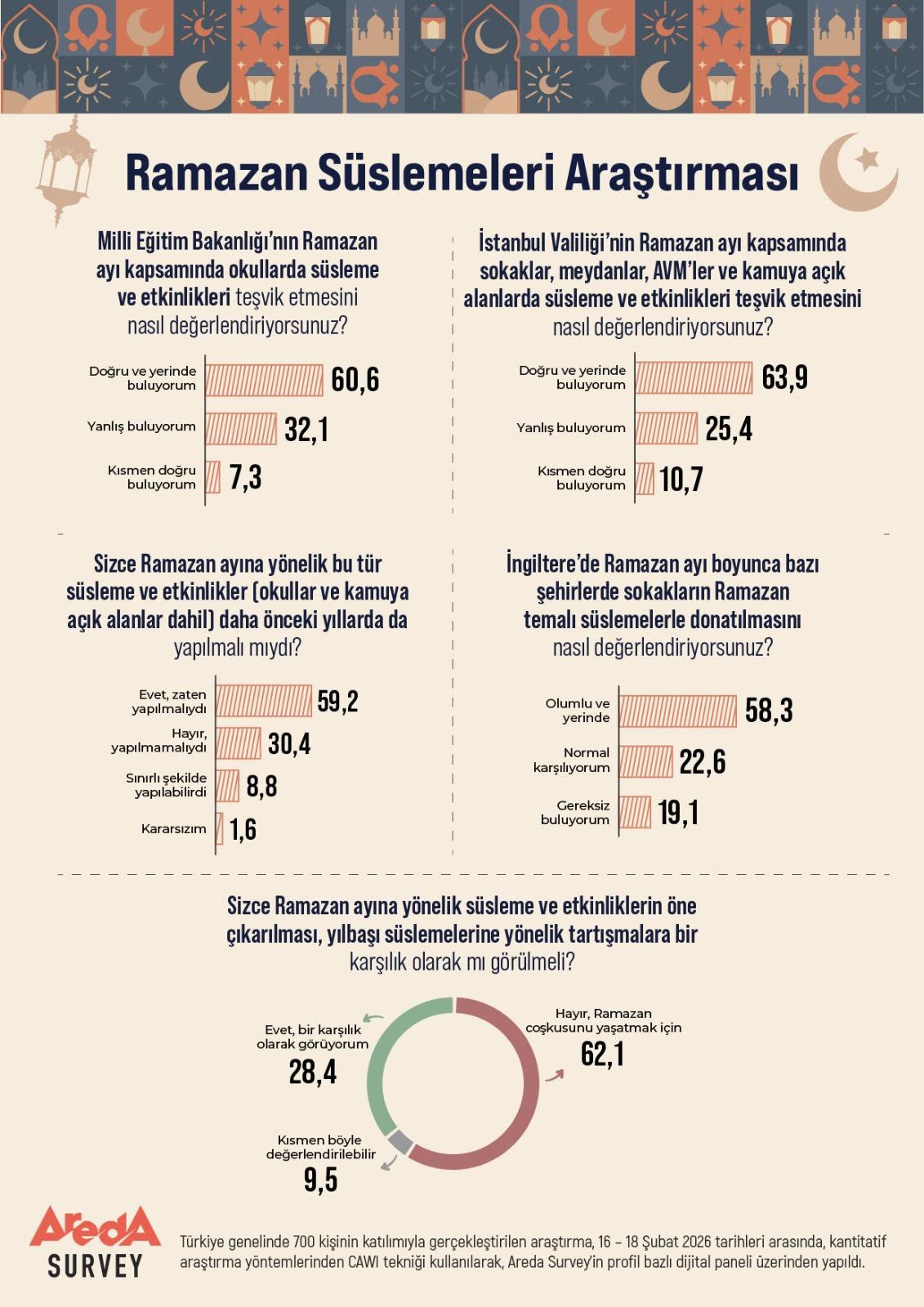 Areda Survey’in “Ramazan Süslemeleri” araştırmasına göre, toplumun yüzde 60,6’sı Milli Eğitim Bakanlığı’nın okullarda Ramazan süslemelerini teşvik etmesini doğru bulurken, katılımcıların yüzde 63,9’u İstanbul Valiliği’nin uygulamalarına destek veriyor. Katılımcıların yüzde 62,1’i ise Ramazan süslemelerinin yılbaşı süslemelerine bir karşılık olmadığını düşünüyor.