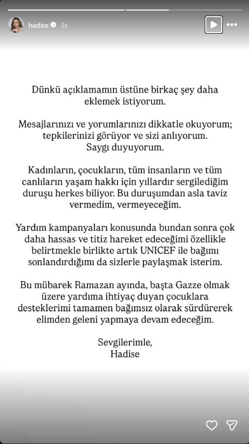 "Dünkü açıklamamın üstüne birkaç şey daha eklemek istiyorum. Mesajlarınızı ve yorumlarınızı dikkatle okuyorum; tepkilerinizi görüyor ve sizi anlıyorum. Saygı duyuyorum. Kadınların, çocukların, tüm insanların ve tüm canlıların yaşam hakkı için yıllardır sergilediğim duruşu herkes biliyor. Bu duruşumdan asla taviz vermedim, vermeyeceğim. Yardım kampanyaları konusunda bundan sonra çok daha hassas ve titiz hareket edeceğimi özellikle belirtmekle birlikte artık UNICEF ile bağımı sonlandırdığımı da sizlerle paylaşmak isterim. Bu mübarek Ramazan ayında, başta Gazze olmak üzere yardıma ihtiyaç duyan çocuklara desteklerimi tamamen bağımsız olarak sürdürerek elimden geleni yapmaya devam edeceğim. Sevgilerimle, Hadise"