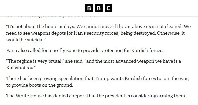 İngiliz medya kuruluşu BBC ise, İran'ın Kuzey Irak'a yönelik saldırılarında bir kişinin öldüğünü, üç kişinin yaralandığını ileri sürdü. Bölgedeki bir Kürt yetkilinin, ABD - İsrail koalisyonundan "hava desteği" istediği iddia edildi:
