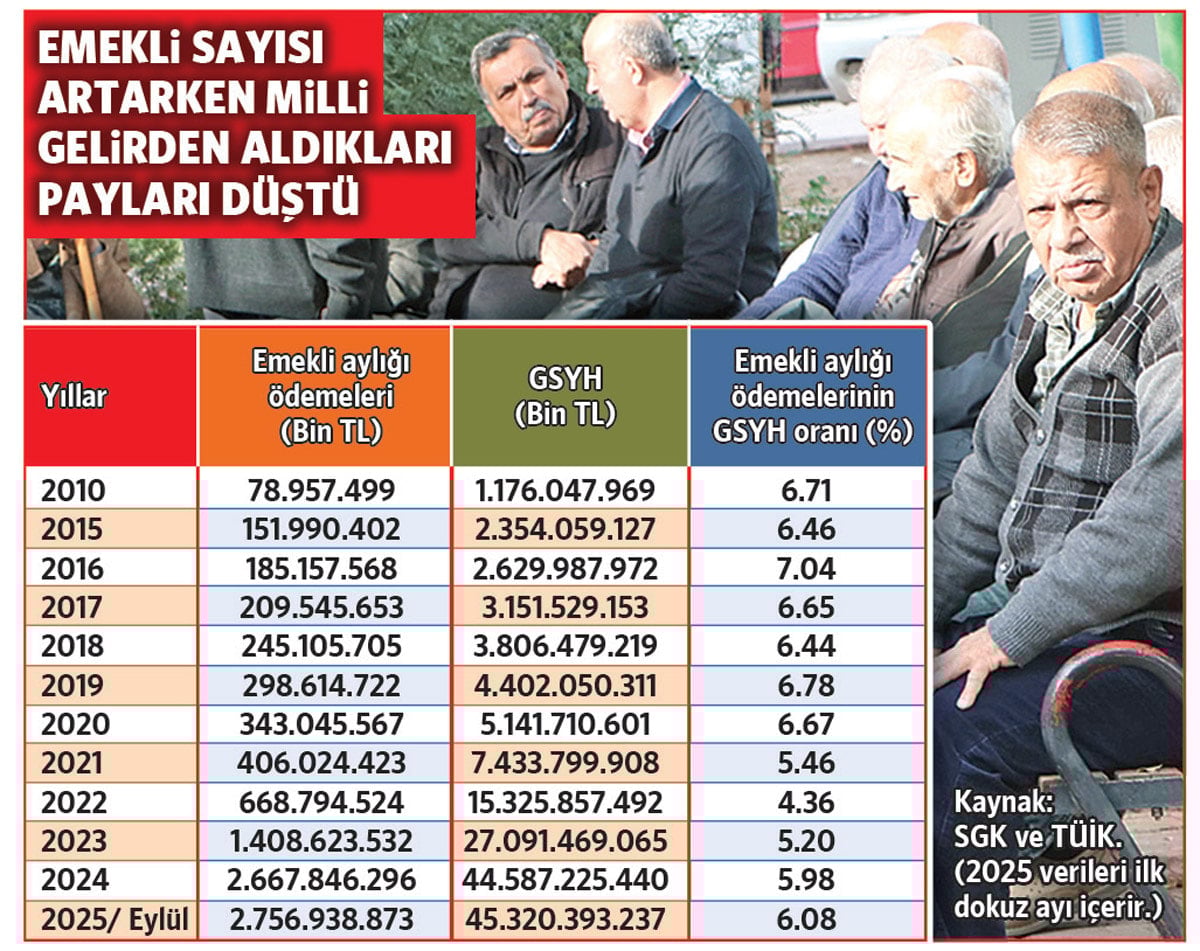 Sosyal Güvenlik Kurumu’ndan, çeşitli şekillerde emekli aylığı alanların sayısı 2010 yılında 9 milyon 518 bin kişi idi. EYT öncesi 2022 yılında bu sayı 13 milyonlar civarında iken 2024 yılında 16 milyon 677 bin kişiye ulaştı. Emekli sayımız hem nüfusun yaşlanması hem de EYT nedeniyle nüfus artış hızından daha fazla arttı. Dolayısıyla nüfus içindeki emekli oranı büyüdü. Peki, emeklilerin nüfus içindeki oranı büyürken milli gelirden aldıkları pay da büyüdü mü? Maalesef, büyümek bir yana payları düştü.