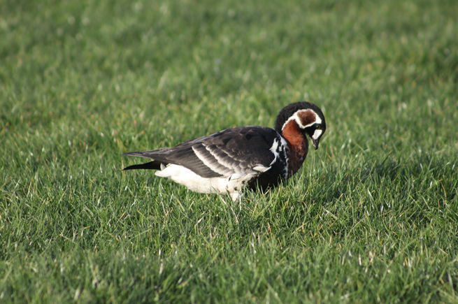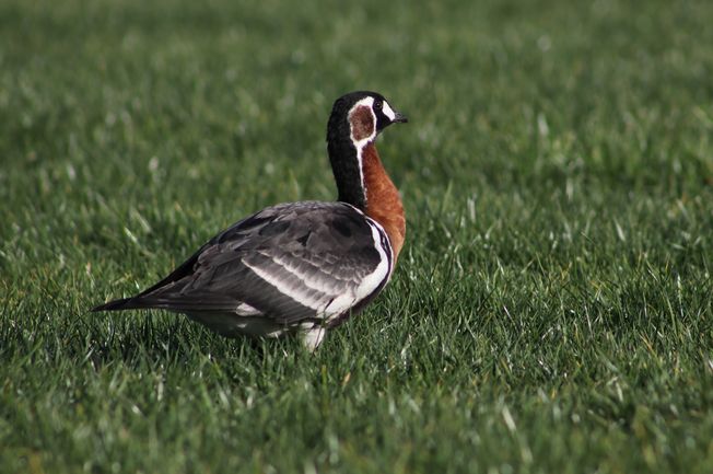 Kahverengi, siyah ve beyaz renkteki tüyleriyle dikkat çekici bir görünüme sahip Sibirya kazı, sahil kesimindeki yeşil alanda gözlemlendi.