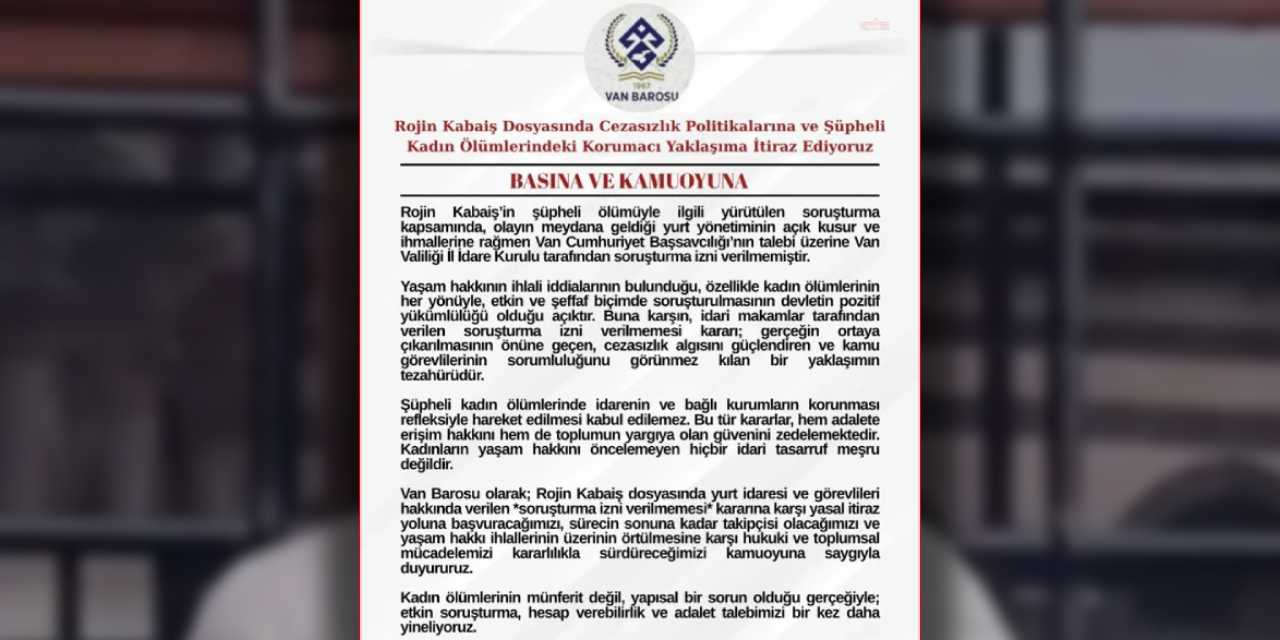 "Şüpheli kadın ölümlerinde idarenin ve bağlı kurumların korunması refleksiyle hareket edilmesi kabul edilemez. Bu tür kararlar, hem adalete erişim hakkını hem de toplumun yargıya olan güvenini zedelemektedir. Kadınların yaşam hakkını öncelemeyen hiçbir idari tasarruf meşru değildir. Van Barosu olarak; Rojin Kabaiş dosyasında yurt idaresi ve görevlileri hakkında verilen soruşturma izni verilmemesi kararına karşı yasal itiraz yoluna başvuracağımızı, sürecin sonuna kadar takipçisi olacağımızı ve yaşam hakkı ihlallerinin üzerinin örtülmesine karşı hukuki ve toplumsal mücadelemizi kararlılıkla sürdüreceğimizi kamuoyuna saygıyla duyururuz. Kadın ölümlerinin münferit değil, yapısal bir sorun olduğu gerçeğiyle; etkin soruşturma, hesap verebilirlik ve adalet talebimizi bir kez daha yineliyoruz."