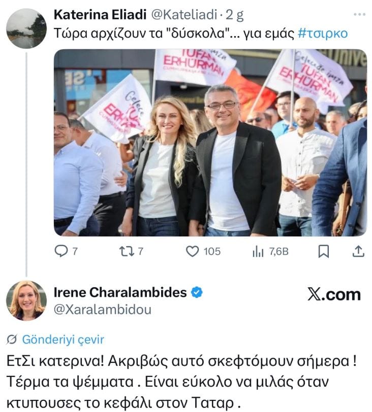 KKTC seçimleri konusunda gazeteciyle hem fikir olduğunu belirten Rum milletvekili, "İşte böyle, Katerina! Bugün tam da bunu düşünüyordum! Yalanlara son. Tatar’a karşı konuşmak kolaydı" dedi.