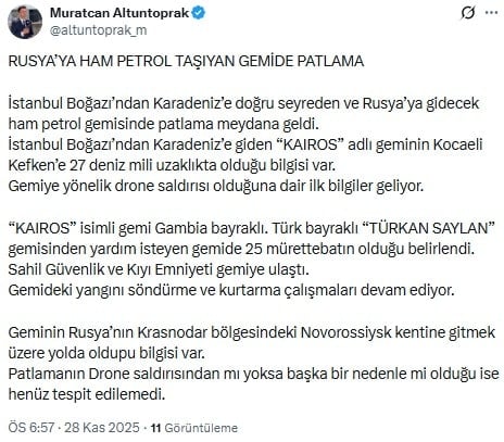 İstanbul Boğazı’ndan Karadeniz’e giden “KAIROS” adlı geminin Kocaeli Kefken’e 27 deniz mili uzaklıkta olduğu bilgisi var. Gemiye yönelik drone saldırısı olduğuna dair ilk bilgiler geliyor.