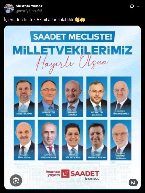 SAADET PARTİSİ’NDEN SERT GÖNDERMEYaşanan gelişmelerin ardından Saadet Partisi Genel Başkan Yardımcısı Mustafa Yılmaz, CHP listelerinden seçilen Saadet Partili milletvekillerini paylaşarak "İçlerinden bir tek Azrail adam alabildi." yazdı.