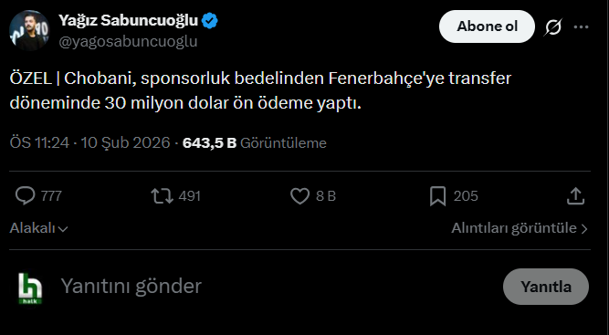 ARA TRANSFERDE 30 MİLYON EURO ÖN ÖDEME YAPTIYağız Sabuncuoğlu’nun haberine göre Hamdi Ulukaya, Fenerbahçe’nin transferleri gerçekleştirebilmesi için mevcut sponsorluk anlaşmalarından 30 milyon dolar ön ödeme yaptı.
