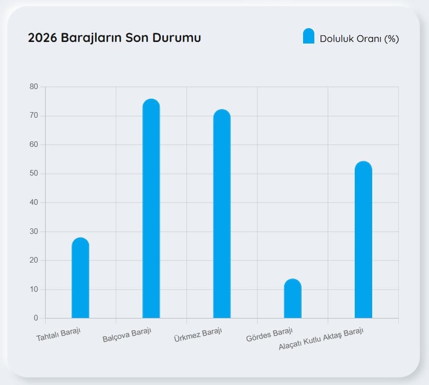 BARAJ DOLULUK ORANLARI NEDEN ÖNEMLİDİR?Baraj doluluk oranları, bir kentin içme suyu güvenliği açısından hayati göstergelerdir. Özellikle İzmir gibi büyük şehirlerde içme ve kullanma suyunun önemli bir kısmı barajlardan sağlanmaktadır. Doluluk oranlarının kritik seviyelere düşmesi; su kesintileri, basınç düşüşleri ve kısıtlamalar gibi uygulamaları gündeme getirebilir. Ayrıca tarımsal sulama, sanayi kullanımı ve ekosistem dengesi de barajlardaki su miktarına bağlıdır. Bu nedenle baraj doluluk oranları yalnızca mevcut su miktarını değil, aynı zamanda kuraklık riski ve gelecekteki su planlaması açısından da belirleyici bir göstergedir.