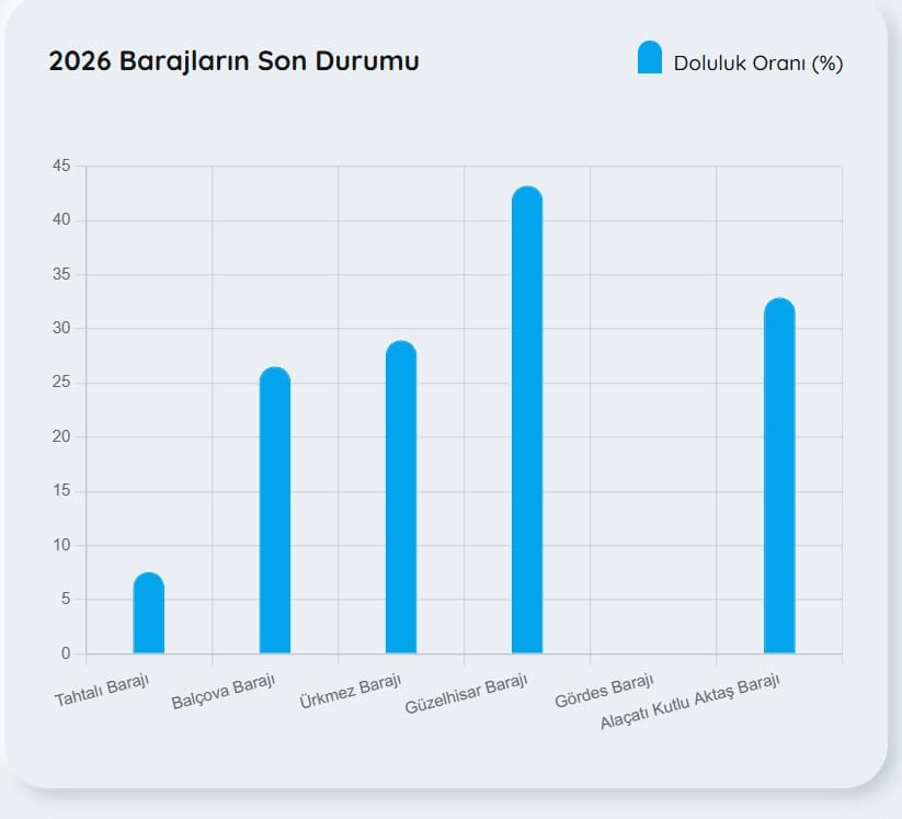 İZMİR BARAJ DOLULUK ORANLARI 2 ŞUBATGüzelhisar Barajı, yüzde 43,22 doluluk oranıyla kentteki en yüksek seviyeye ulaşırken, Gördes Barajı tamamen kurudu. Tahtalı Barajı ise yüzde 7,56 ile en düşük doluluk oranına sahip baraj olarak kayıtlara geçti.
