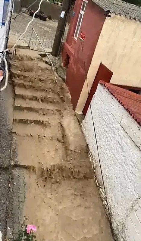 Yeni İstanbul Sokak'ta bazı vatandaşlar cadde ve sokaklarda oluşan su birikintisi nedeniyle evlerine giremedi. İtfaiye ve belediye ekipleri, iş makineleri eşliğinde su tahliye çalışması yürütüyor.