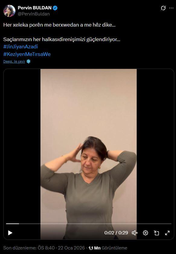 Terör örgütü militanlarının saçlarını ördüğü videolara destek paylaşımlarına, TBMM Başkanvekili Pervin Buldan’da dahil oldu. Buldan, sosyal medya hesabından saçlarını ördüğü video ile terör örgütü bünyesinde bulunan kadın militanlara destek verdi.