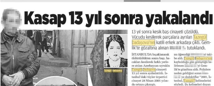 “Bu bizim için çok önemli bir gelişmeydi. Hemen Interpol üzerinden Azerbaycan’da yaşayan oğluna ulaştık. Oğlundan kan örneği aldırdık. Alınan örnek, kimsesizler mezarlığında bulunan başsız kadına ait DNA ile karşılaştırıldı. Yapılan DNA incelemesi, 13 yıllık sır perdesini araladı. Sonuçlar geldiğinde, kesik baş ile gövdenin aynı kişiye ait olduğu ve DNA’nın birebir örtüştüğü ortaya çıktı. Böylece başsız kadın cesedinin, kayıp başvurusu yapılan Azerbaycan uyruklu Tazegül Dadaşova olduğu kesinleşti.”
